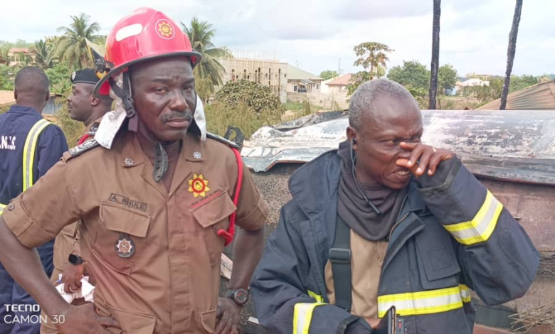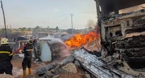 Two officers of the Ghana National Fire Service have been injured following a dangerous secondary explosion during efforts to contain a tanker fire at Potsin Junction along the Kasoa-Winneba Road in the Central Region.